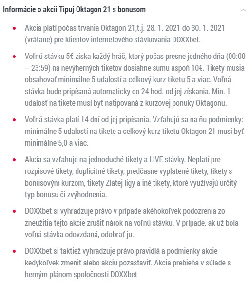Voľná stávka 5 € v rámci akcie Oktagon 21 s bonusom sa pridelí do 3 dní od skončenia akcie a má platnosť 14 dní od jej pripísania a vzťahujú sa na ňu tieto podmienky: minimálne 5 udalostí na tikete a celkový kurz tiketu musí byť 5,0 a viac. Po splnení podmienok sa Ti voľná stávka zobrazí priamo v tikete po výbere zápasov. Informácie o získaní voľnej stávky nájdeš po prihlásení sa, a to zobrazené v sekcii priamo nad tiketom.